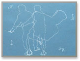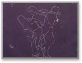 La lisibilité du motif n’est pas immédiate. L’empreinte du cuivre sur le papier, légère, laisse trace de pointillés qui se posent, se superposent en une arachnéenne composition. Une silhouette apparaît, qui se tend, se tourne et bouge sous nos yeux ; elle se démultiplie comme par jeu et restitue l’élan du personnage filmé dont nous sentons vibrer l’énergie.